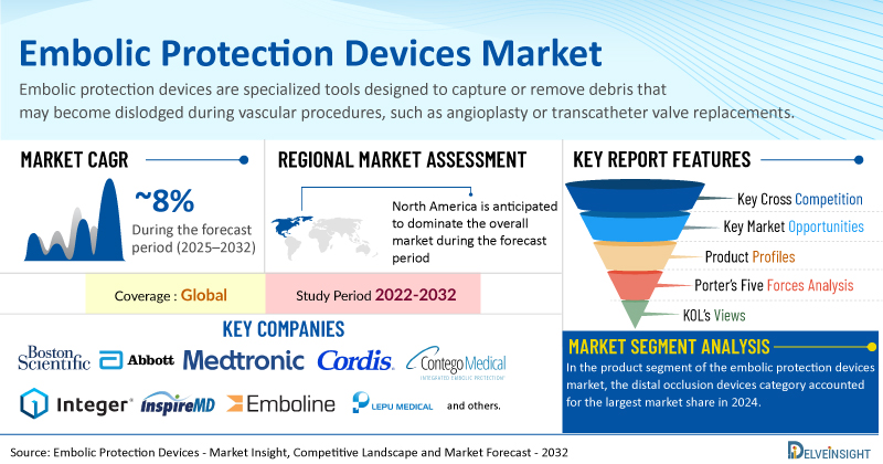 The demand for embolic protection devices is being primarily driven by rising cases of cardiovascular disorders and neurovascular disorders, growing awareness of the cardiovascular and stroke risks associated with medical procedures, and increase in technological advancements with increase in product development activites among the key market players, are key factors contributing to the positive growth of the embolic protection devices market during the forecast period from 2025 to 2032.
